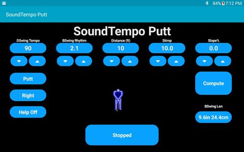 Select your downswing Tempo in beats per minute and your Backswing Rhythm ratio, then select green speed and the distance you want to roll the ball. Compute the backswing length in inches/cm. Press the Run/Stop Button and listen to the tones in your headphones. You hear the pre-shot tones, then, the backswing, the downswing and an impact chirp at precisely when the impact should occur. Watch the PuttBot to understand how the tones relate to the putting stroke.